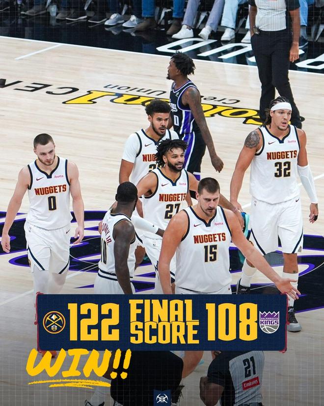 約基奇遠投不進,隨后還出現(xiàn)犯規(guī),尤班克斯2罰1中。掘金進攻24秒違例,尤班克斯上籃得分,約基奇命中三分球還以顏色,距離終場僅剩100秒,掘金領先10分得以鎖定大局。尤班克斯進攻犯規(guī),約基奇助攻布朗轟進三分球,尤班克斯上籃得手。布勞恩外線得分,德羅贊遠投打鐵,比賽時間走完。最終,掘金以122比108掀翻國王。