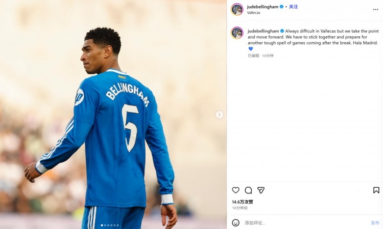 貝林厄姆曬出自己的比賽照,并配文:“客戰(zhàn)巴列卡諾總是很艱難,但我們拿到了一分并繼續(xù)向前看。我們必須團(tuán)結(jié)一致,為國(guó)家隊(duì)比賽周之后的又一輪密集賽程做好準(zhǔn)備。馬德里前進(jìn)!”