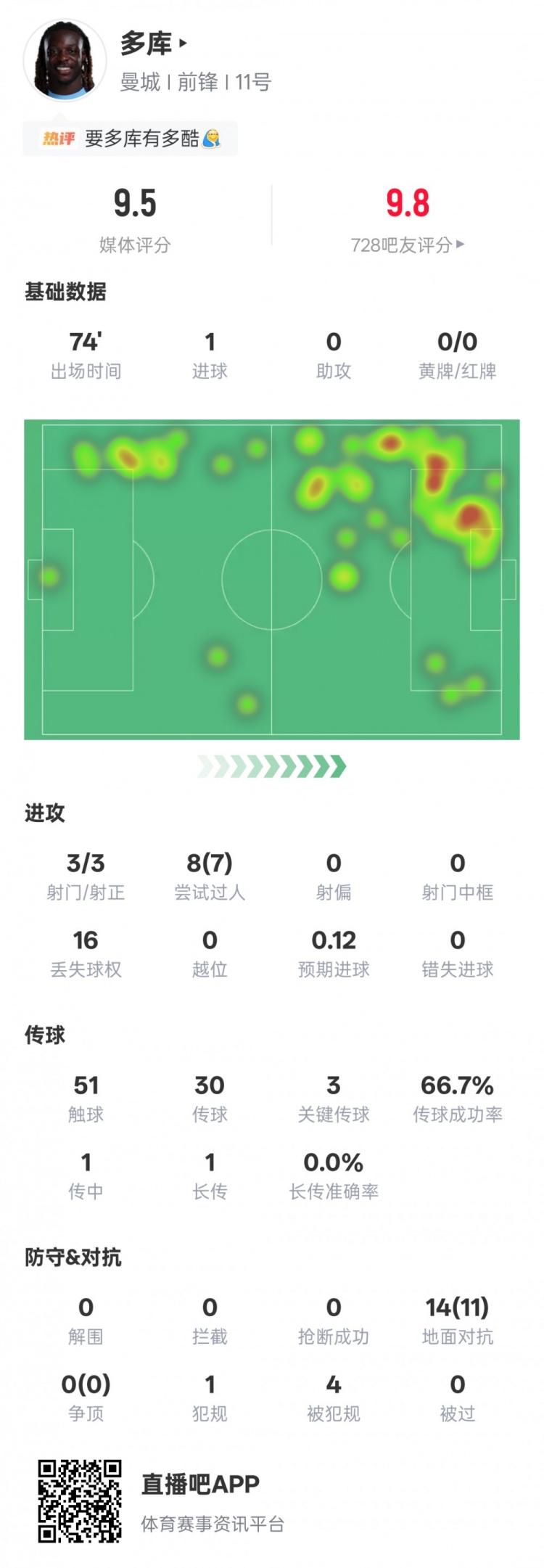 多庫本場比賽數(shù)據(jù):1進(jìn)球7過人成功3關(guān)鍵傳球,評分9.5